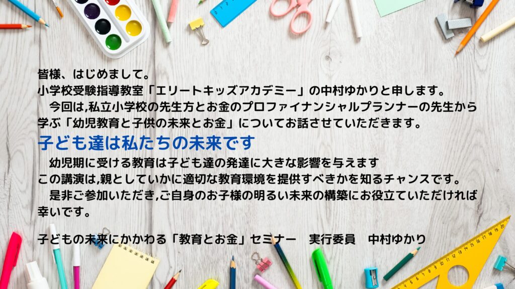 1. 子供の未来にかかわる「教育とお金」セミナー 私立小学校の選び方 秋の大説明会